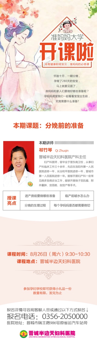 2017年8月26日上午9:30,晋城妇科医院孕妇学校将如期与准妈妈们见面,此次主讲的主题为《分娩前的准备》,本期课堂讲师是著名孕妇课堂讲师、资深产科专家、晋城妇科医院名医馆专家祁竹琴主任。